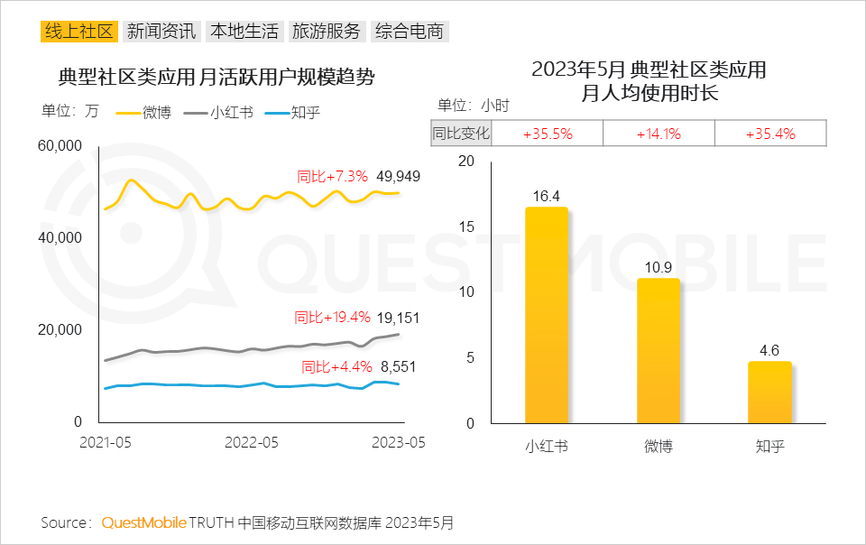QuestMobile2023年5月数据显示,微博、小红书、知乎APP活跃用户规模增长的同时用户粘性进一步提升,月人均使用时长为16.4小时、10.9小时、4.6小时,同比增长分别为35.5%、14.1%和35.4%。