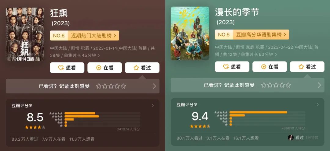 2023年的上新剧集TOP10中,有7部作品豆瓣评分人数超过了10万,且有《漫长的季节》《狂飙》两部评分人数超过了77万的作品,而在2022年,仅有5部作品豆瓣评分人数超过10万,评分人数前二分别是75万的《开端》和55万的《梦华录》。