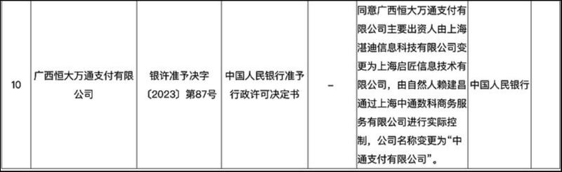 根据编号为“银许准予决字〔2023〕第87号”的中国人民银行准予行政许可决定书,中国人民银行同意万通支付的主要出资人由上海湛迪信息科技有限公司变更为上海启匠信息技术有限公司(下称“启匠信息”),由自然人赖建昌通过上海中通数科商务服务有限公司(下称“中通数科”)进行实际控制。
