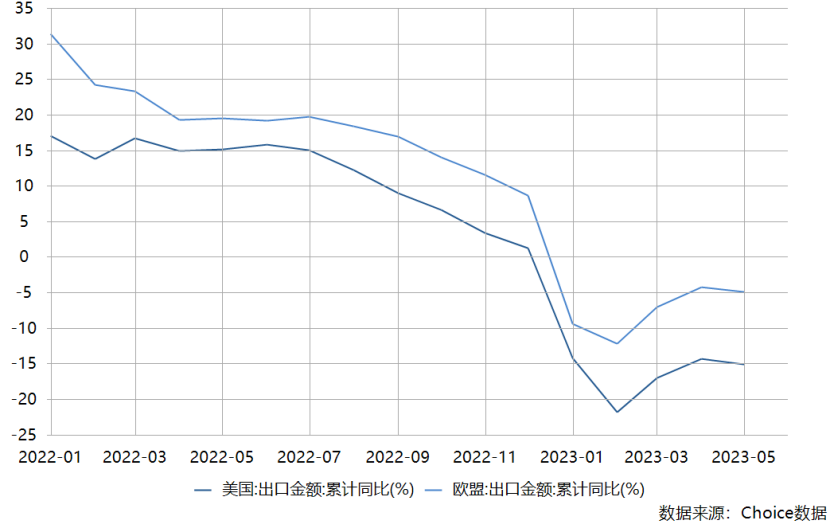 海关总署数据显示,前5个月,中国对欧盟出口金额累计值为2153亿美元,同比下跌4.9%;对美国出口金额累计值为2007亿美元,同比下跌15.1%。![]()