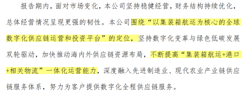 在上半年业绩预告中,中远海控称,面对市场变化,将围绕“以集装箱航运为核心的全球数字化供应链运营和投资平台”的定位,加快推动海内外供应链资源布局,不断提高“集装箱航运+港口+相关物流”一体化运营能力。