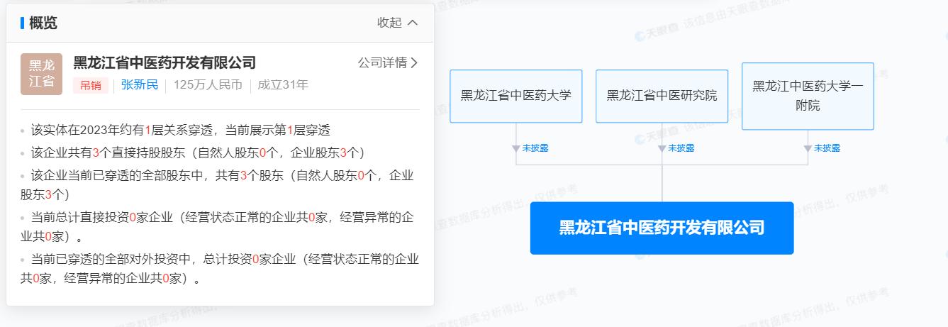 天眼查资料中,黑龙江省中医药开发有限公司成立于1992年6月,位于黑龙江省哈尔滨市,是一家以从事医药制造业为主的企业。该公司已于2011年10被吊销,公司的股东中,除了张立国的母校黑龙江中医药大学外,还有黑龙江省中医研究院和黑龙江中医药大学一附院。