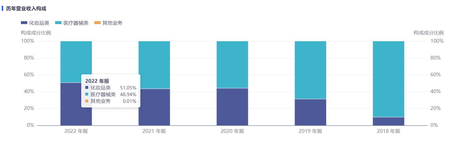 2022年,敷尔佳化妆品类营业收入占比超一半,超过了早期的医疗器械类产品。此也是IPO期间,该公司所处行业分类变更的原因。