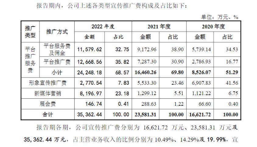 以2022年为例,敷尔佳将平台宣传推广费分为平台推广服务费、形象宣传推广费、新媒体营销和展会费,分别占宣传推广费的68.57%、7.83%、23.18%、0.41%。