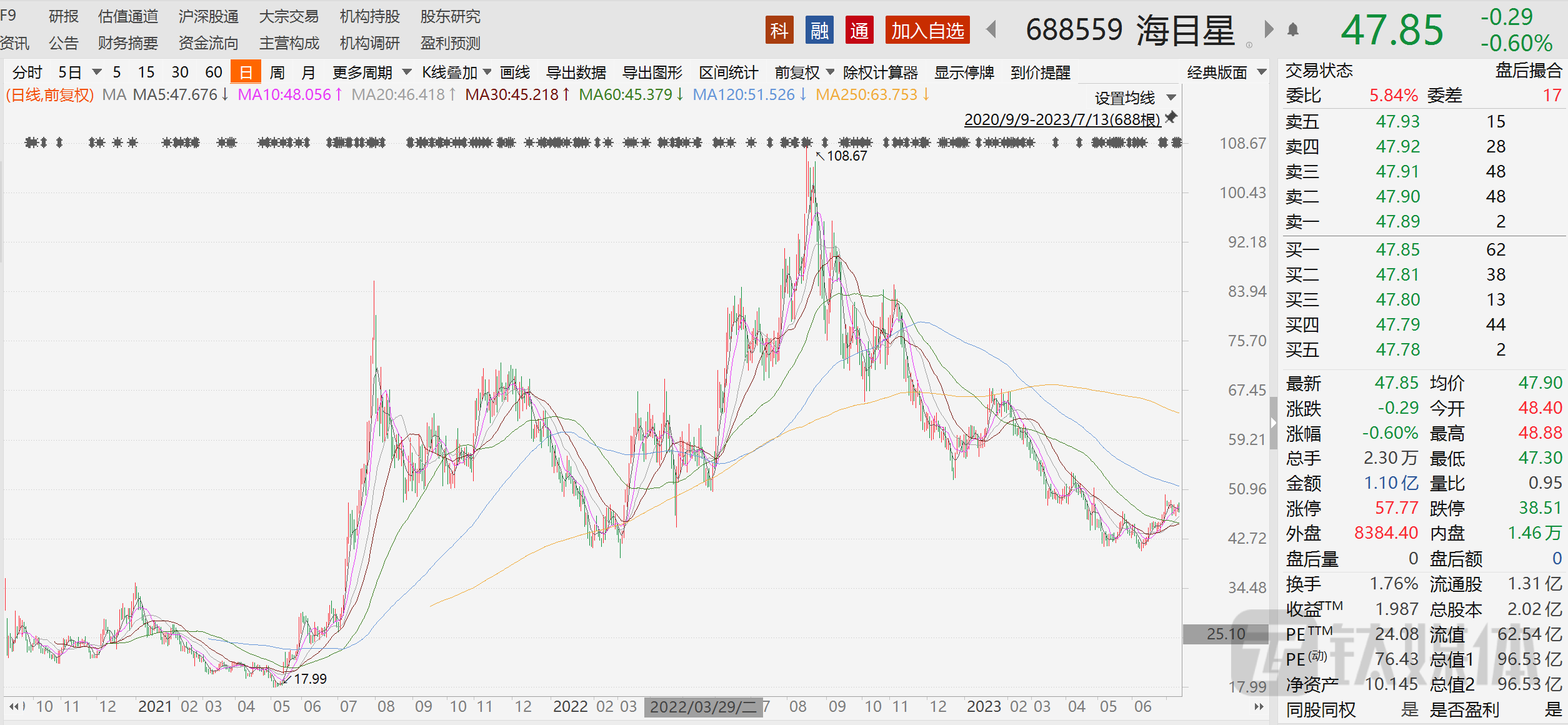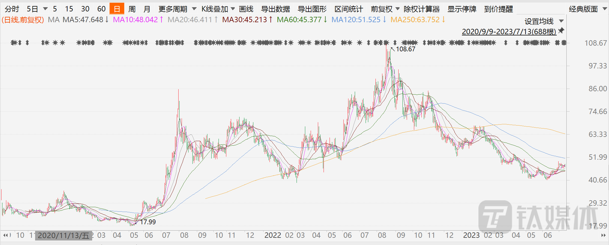 从k线图可以看出,公司于2020年9月登陆科创板,当时发行价格为14.56元,仅2年时间,其股价于2022年8月创下108.86元的历史高点,股价涨幅更是高达646%。而高点过后其股价却是跌跌不休,最低跌至41.3元。
