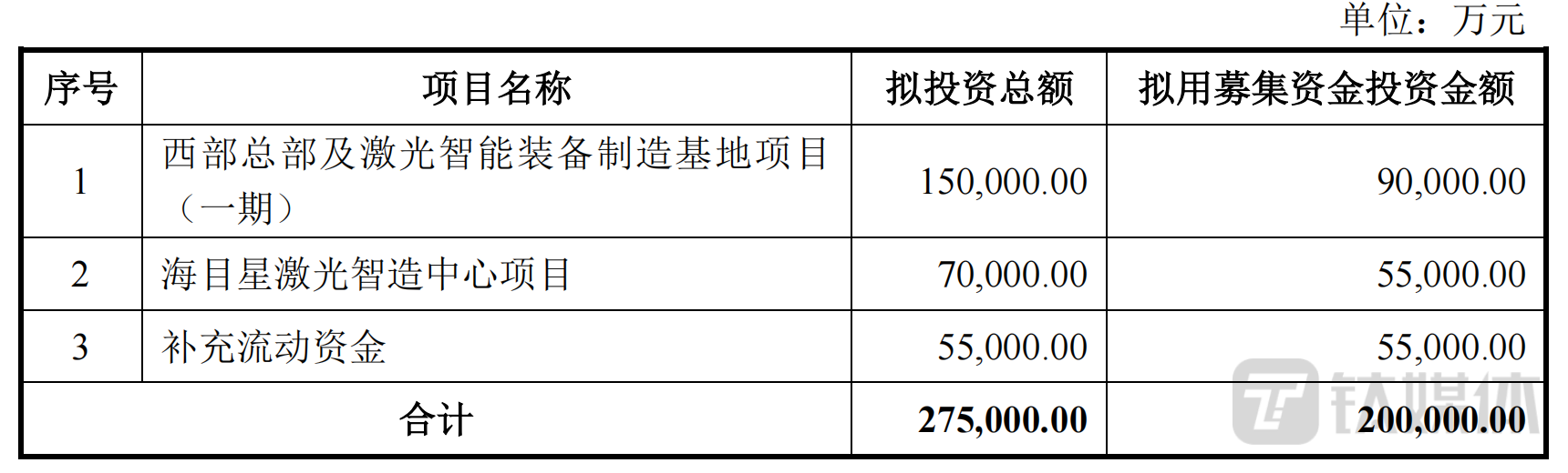 预案显示,公司将用募集资金中的9亿元,用于西部激光智能装备制造基地项目(一期),该项目拟投资总额为15亿元;5.5亿元用于海目星激光智能中心项目,该项目拟投资总额为7亿元;余下5.5亿元用于补充流动资金。