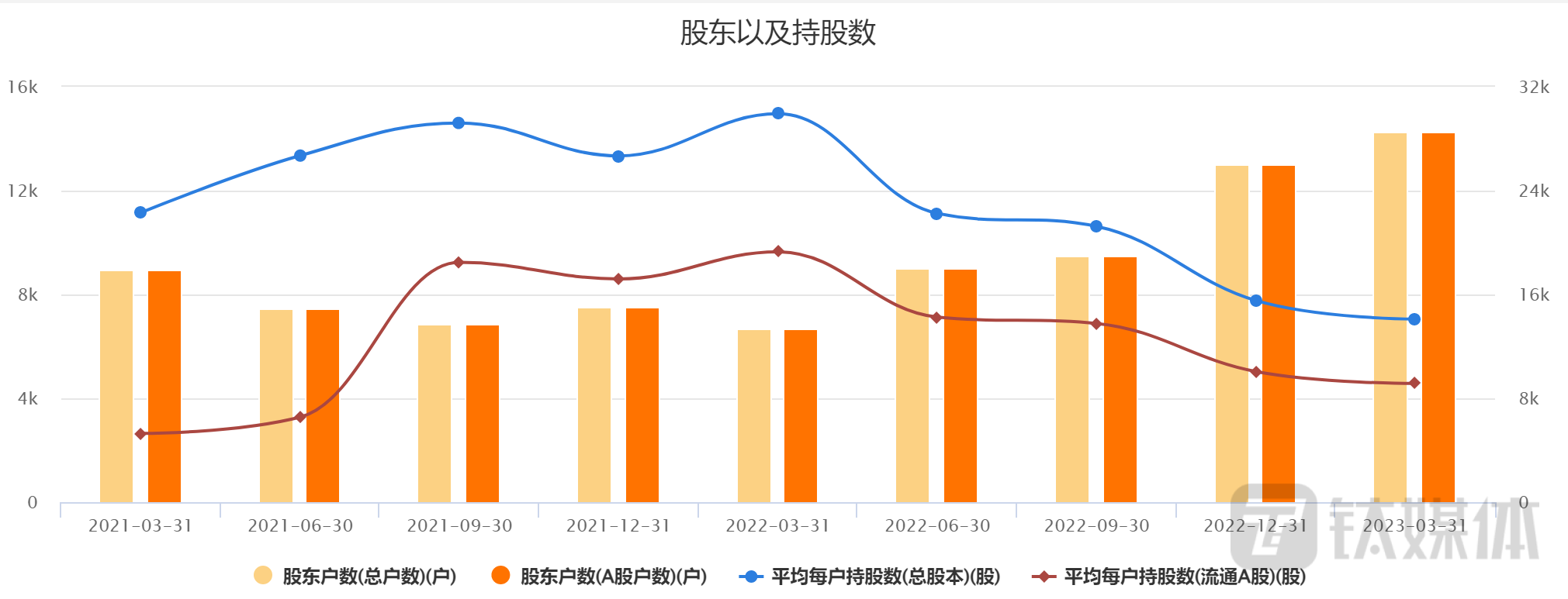 其次,从去年6月份开始,公司股东及持股数就开始逐期增加,这可能也意味着其筹码越来越分散。此现象或许说明散户较多,而机构或者主力较少,这可能导致盘面不稳定。