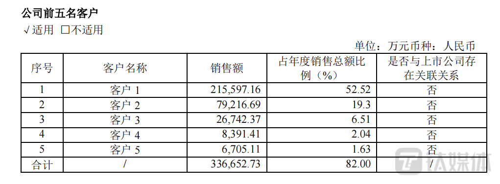 其次,公司客户集中度高,存在对大客户的依赖。钛媒体APP发现,公司的客户主要为消费电子、新能源电池等应用领域龙头或知名企业客户。数据显示,2022年公司向前五名客户销售额33.6亿元,占年度销售总额82.00%。