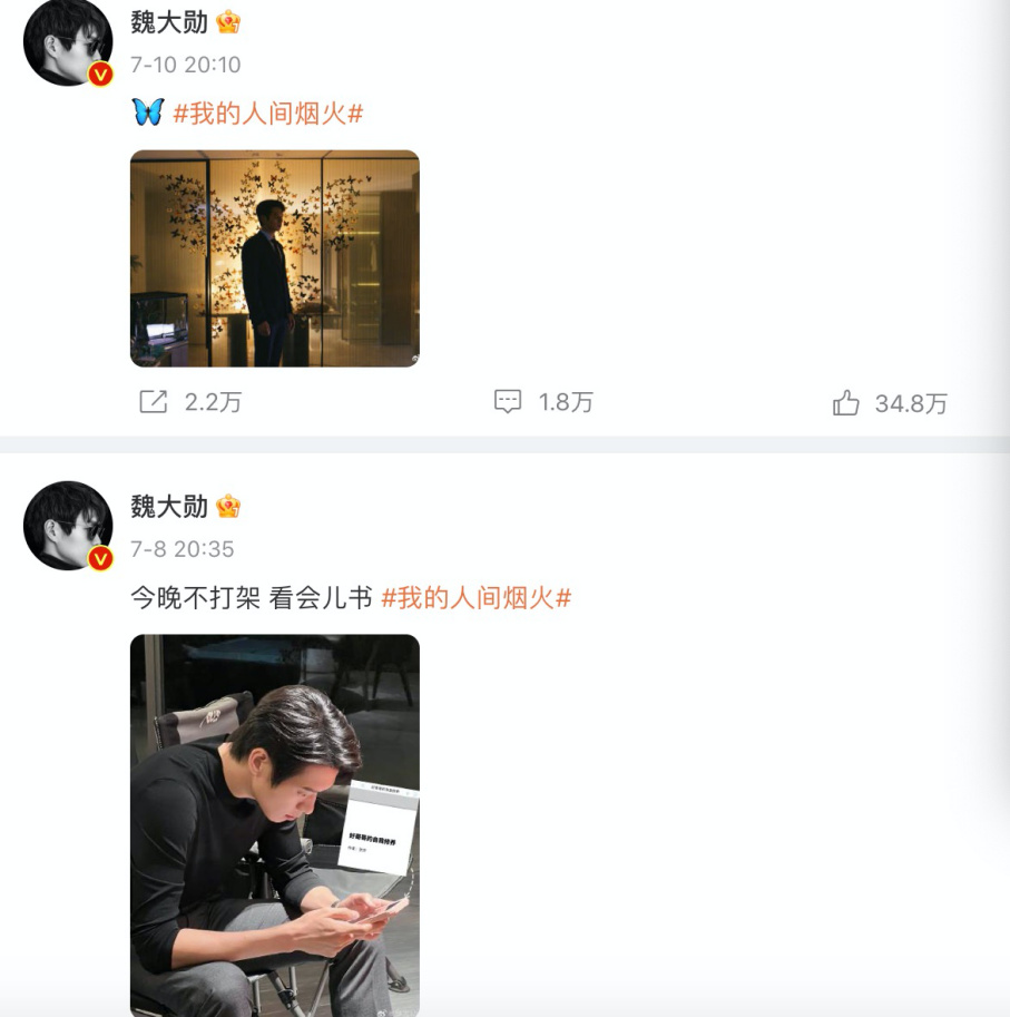 从数据来看,不仅是魏大勋和孟晏臣轮番上热搜,魏大勋个人微博的评论转发量相比剧集播出前均实现翻倍。而紧接着,魏大勋的相关信息也随之开始轮番轰炸网友视线,如“魏大勋是JYP第一个中国演员”、“魏大勋是王嘉尔前辈”、“魏大勋是自己超话主持”等等细枝末节都被翻出讨论,连他自己在各个平台发布的剧照,其选片审美、拍照角度也纷纷被网友认可。可见爆剧、爆角色给演员带来的蝴蝶效应非同一般。