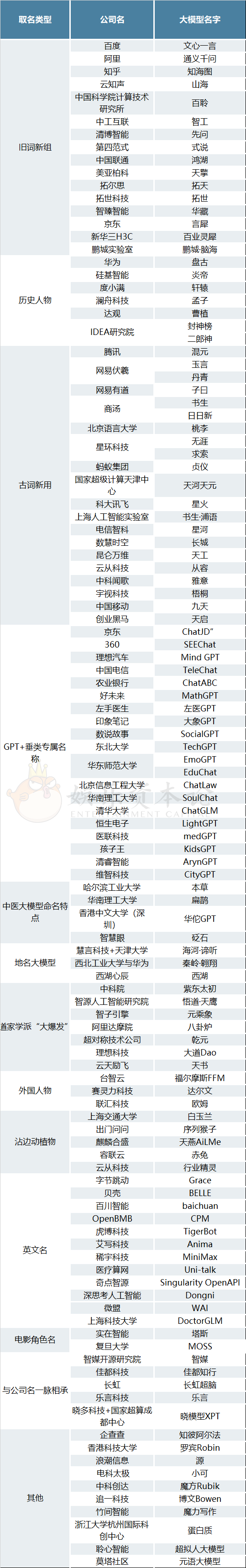 做大模型的公司,基本可以分为互联网巨头、科研院所、AI公司与行业公司几大类。整体而言,各家在取名上的不同策略,也彰显了其在大模型赛道上的不同定位。