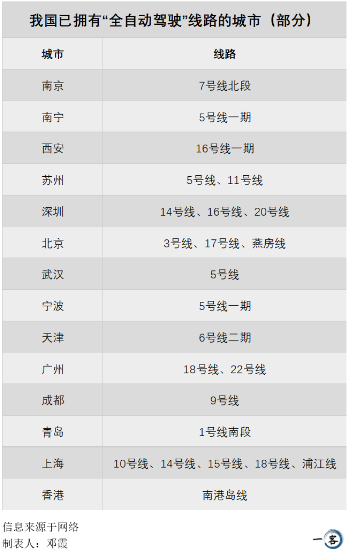 据出行一客不完全统计,目前中国拥有“全自动驾驶”线路的城市已达十余个,不仅包括北上广深这样的一线城市,也有宁波、南宁、青岛等地。平均每三个有地铁的城市中,就有一条“全自动驾驶”路线。