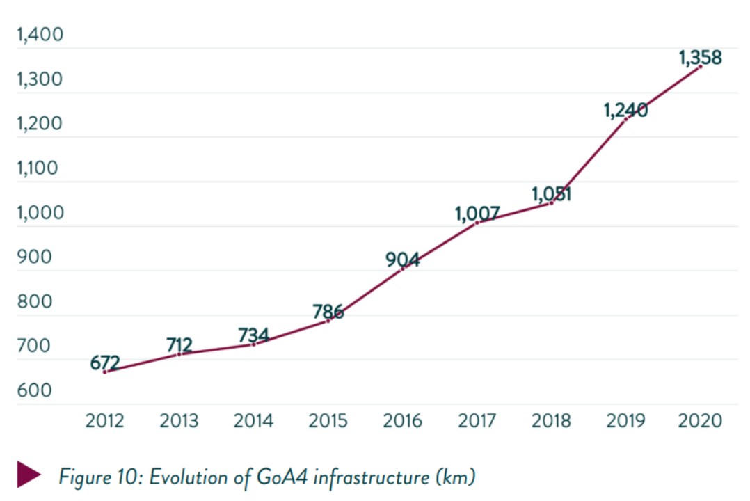 截止2020年底,全球达到GoA4级的线路里程(单位:Km)/图源:UITP官网