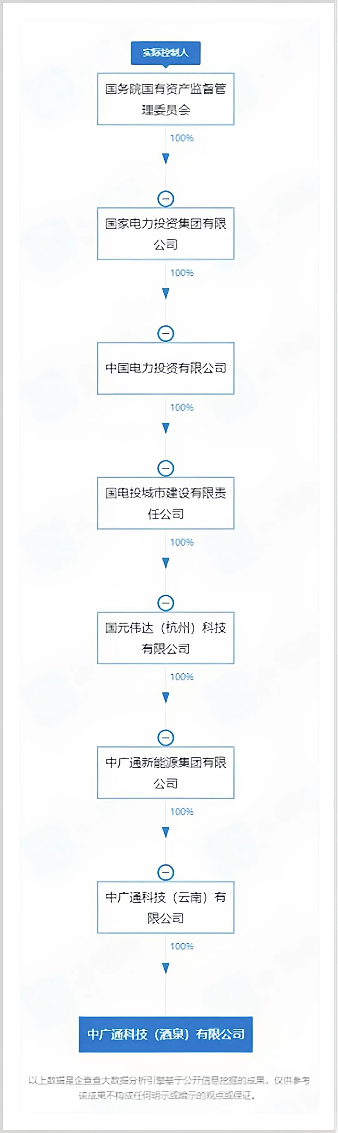 国家电投集团——中国电力投资有限公司——国电投城市建设有限责任公司——国元伟达(杭州)科技有限公司——中广通新能源集团有限公司——中广通科技(云南)有限公司——中广通科技(酒泉)有限公司。
