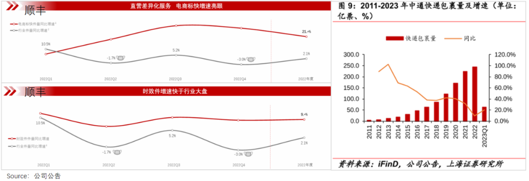 2022年,顺丰电商标快单量增速为21%,远高于时效件9%的增速;主打经济型快递的中通,2023Q1单量增速也恢复了增长,并且上调了全年业务量指引,扬言“市场份额年增长至少1.5个百分点”。