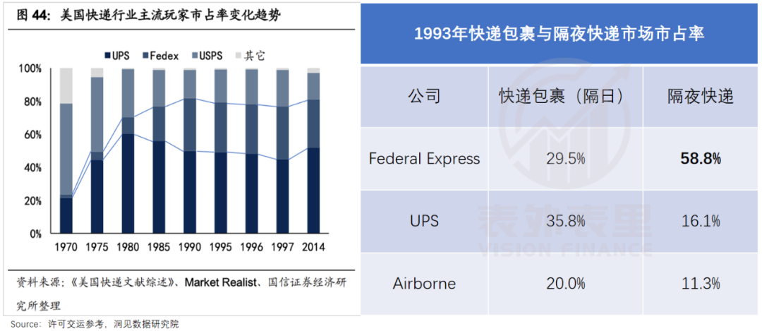 有此依仗,“小喽啰”FedEx自然敢叫板“老大哥”,甚至在80年代末成功虎口夺食,市占率大幅提升。在讲究时效的隔夜送快递上,份额更是狠狠碾压了UPS。
