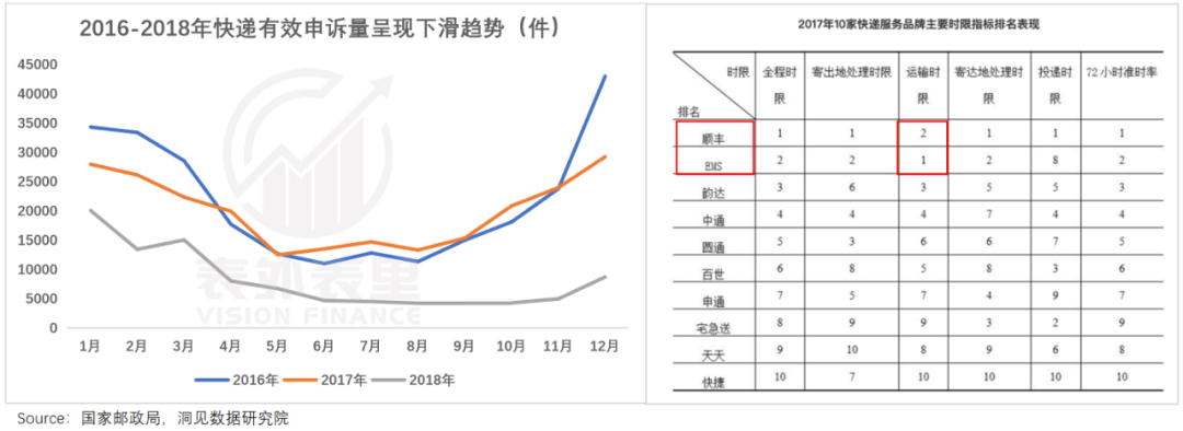 具体来看,2017年的时效性指标的排名中,顺丰首次在“运输时限”上输给了EMS;2018年,三通一达也相继推出自己的时效件产品,大举攻入顺丰腹地。