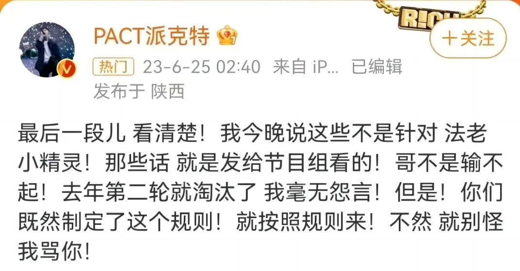 前段时间,说唱歌手派克特在微博向《中国说唱巅峰对决》喊话,指责节目组制定说脏话扣分规则,却没有按照规定执行,引起了一场争论。