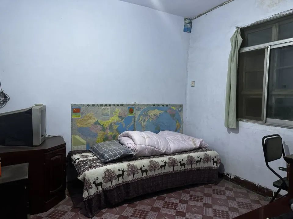 晚上9点半,除了路灯,小区里也鲜有灯光亮起。房子在二楼,天花板像是被水泡过,厕所的灯泡一闪一闪,厨房的墙皮有些脱落。房间里贴着两张泛黄的世界地图,看着颇有“年代感”。彭骏没太在意这些,他铺了张床单,在一张折叠桌上摆上自己的笔记本电脑,就此住下了。