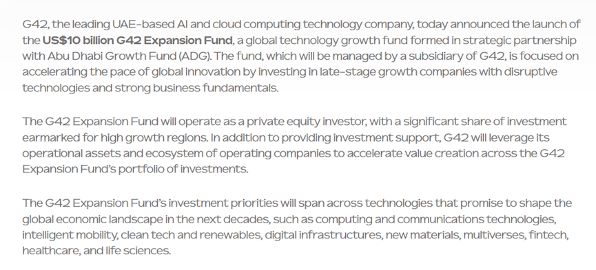 根据维基百科,G42在阿联酋王室成员谢赫・塔努恩・本・扎耶德・阿勒纳哈扬控制下。根据公司官网信息,G42 Expansion Fund系G42与阿布扎比增长基金(ADG)联合成立,由G42子公司进行管理。