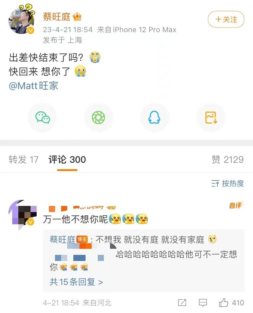 每天都发微博高呼“旺旺”的蔡旺家,还因为在微博大胆开麦,吐槽“开会好累”、“失眠睡不着”,引发网友共情,他的评论区还吸引了不少网友打卡。