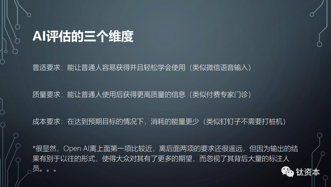 第三,替代现有的AI成本,需要回归到工具的本质逻辑。始终要明白,面对所有TO B和TO C场景,最终要看客户是否愿意使用并付费。细分的场景很多,但是每个人能理解的场景的不多,只有从自己能理解的场景去找投资机会。