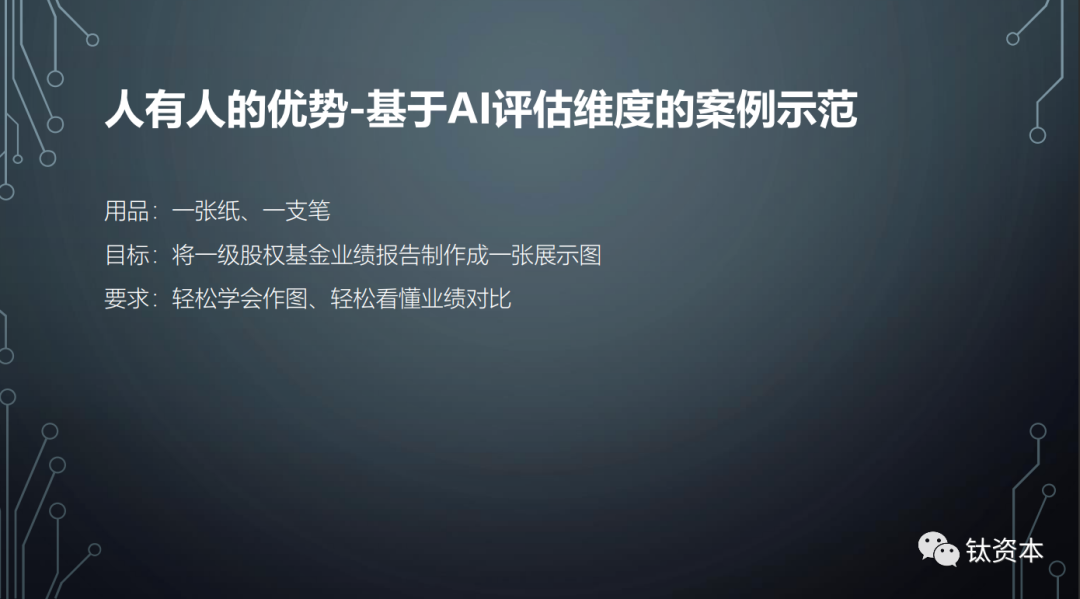 回到评估AI优势的角度,我们会将人类和AI进行比较,人类相较于AI的优势在于其具备抽象思考能力。比如,我在进行GP业绩的评估、对比工作时,发现GP提供的材料非常繁杂,我想通过最简单、最直观的方式把GP的业绩展示出来并进行对比,只用一张纸和一支笔,将一级股权基金的业绩制作成一张展示图。任何人都能轻松看懂业绩的对比。如果我输入以上的要求文字,AI是无法完成的,因为这个方法过去没有人用过,互联网也没有这样的记录,它自然无法生成。