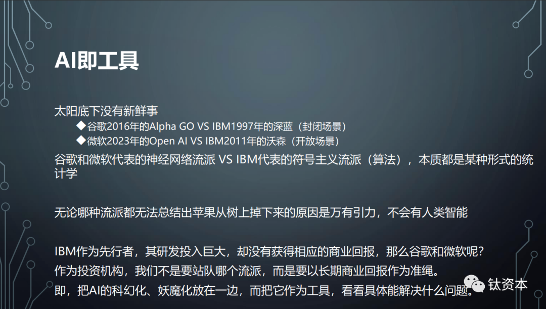 另外,大家也会注意到,今年OpenAI在图像生成和语言对话方面的表现,似乎很像人类,但在2011年,IBM的沃森在医疗场景下或者更早的智力问答场景下进行了展示。IBM在早期的下棋和问答方面取得的成果使用的技术,和我们目前看到的谷歌和微软采用的技术是不同的技术流派,一个是符号主义,一个是神经网络。这两个流派代表了不同的方法,但本质上都是某种形式的统计学,通过强大的计算能力呈现出较好的展示结果。