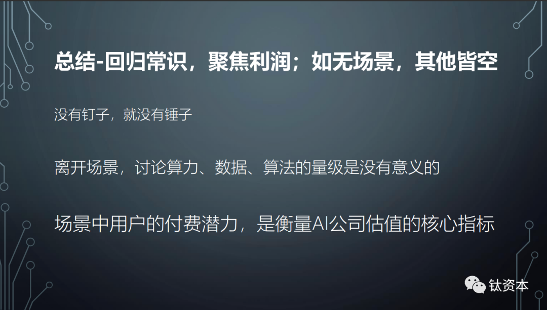 最后,总结一下判断人工智能赛道的核心逻辑:回归常识、聚焦利润;如无场景,其他皆空。
