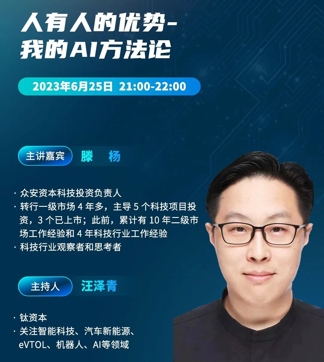 未来AI可能带来哪些技术发展和社会变革?有哪些投资方向及投资方法论?近期,钛资本邀请到众安资本科技投资负责人滕杨进行分享,主题是“人有人的优势,我的AI方法论”。滕杨作为众安资本科技投资负责人,转行一级市场4年多,主导5个科技项目投资(其中2个项目为AI项目),3个已上市(其中1个为AI项目);此前,拥有10年二级市场工作经验和4年科技行业工作经验,是科技行业观察者和思考者。本次分享主持人是钛资本汪泽青,以下为分享实录: