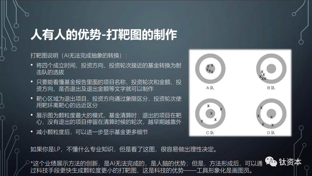 举个例子,如果有四个基金,它们的成立时间、投资方向、投资轮次接近,我们进行一次抽象转换,将一级业绩评估中的投资眼光准不准转换为打靶准不准。而这种抽象转换,AI是无法实现的,只有人类的思维方式才能够实现。
