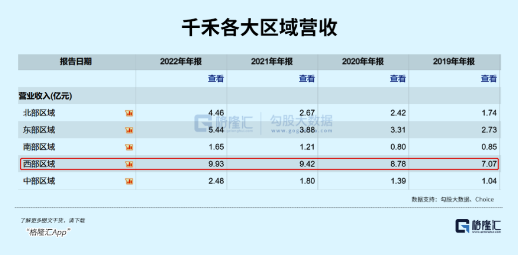 西部区域是千禾大本营。2018-2022年分别贡献营收的比例为58.8%、52.7%、52.6%、49.6%、41.4%。该市场还有下沉空间,但未来占比应该还有望继续下行。
