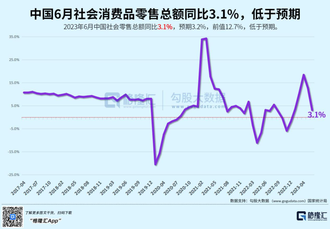 具体到社零消费上,6月同比增长3.1%,环比增长0.23%。两年平均增速为3.1%,而2-5月分别为5.1%、3.3%、2.6%、2.5%。可见,6月消费边际有所改善,但绝对值处于多年低位水平上。在疫情之前,社零消费增速至少还有8%以上,多数年份均在10%以上。