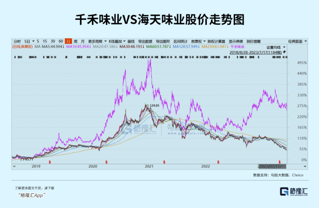 其中,千禾味业早盘一度逼近跌停,最终大跌7.8%,较5月5日高点回撤23%,较2021年2月历史高峰回撤42%。不过,千禾较去年11月初仍然反弹近30%,而海天味业早已跌破去年低点,较历史高峰回撤63%。