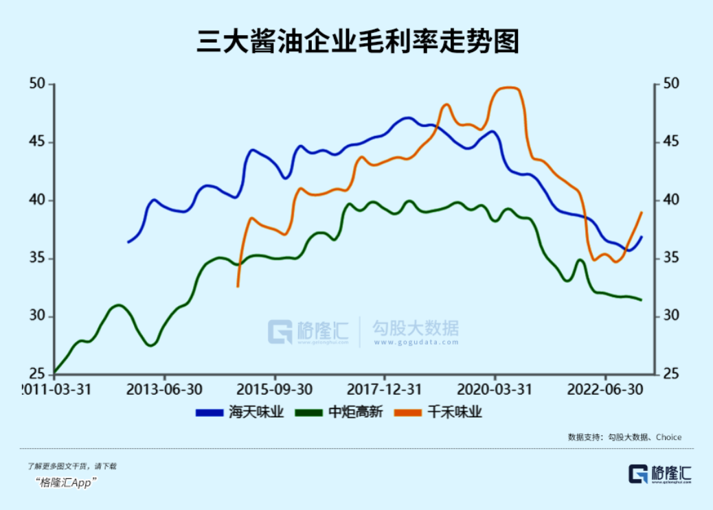 千禾2008年推出首款零添加酱油“头道原香”系列,2018年更加聚焦在零添加,并以“零添加、头道原香、自然酿造”为卖点。发力零添加最早,在消费者心目中有较为深刻的认知,以致于明显受益于海天事件。从毛利率看,千禾从2022Q3的34.73%回升至2023Q1的39%,再次超越海天味业。