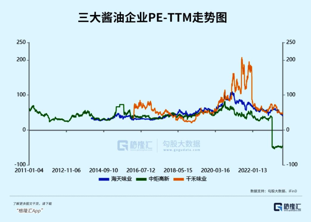 2021年2月之前的那一波食品饮料大牛市中,海天和千禾的估值被拔高至100倍以上,而质地较差的中炬高新也去到了70倍。