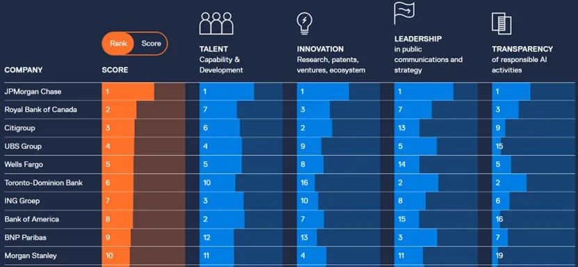 为了做这个榜单,Evident Insights收集了数百万个数据点,基于银行财报和一系列第三方数据源的公开数据,在50多位领先的人工智能和银行业专家的参与下,建立起这个榜单。