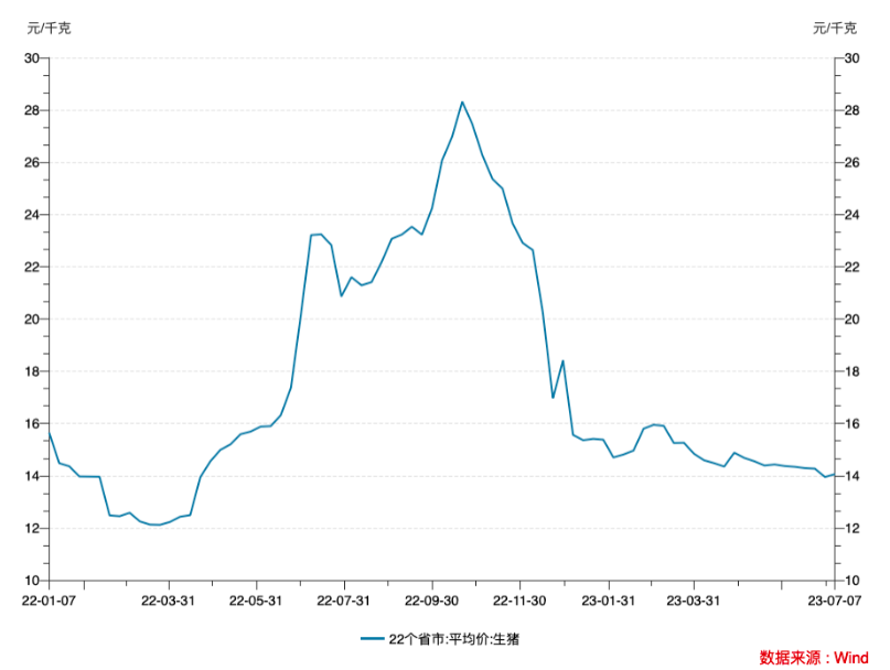 2022年以来,全国22个省市生猪价格走势。数据来源:Wind