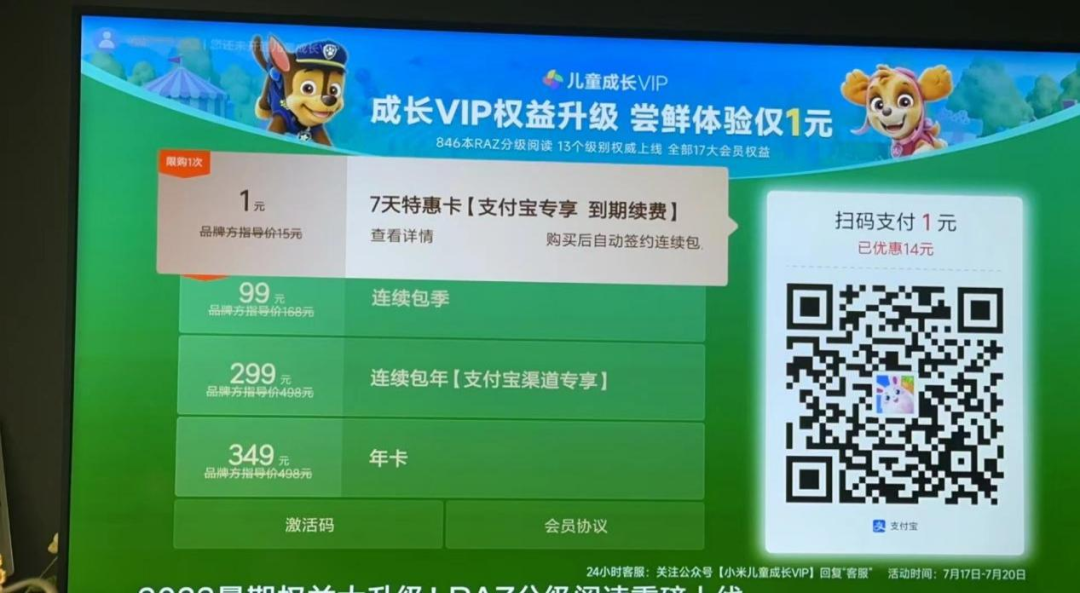 她家使用的小米电视,尽管内容页面丰富,分为影视、音乐、经典、儿童等专区,为了方便,办了248元的小米影视会员年卡,却没想到儿童成长会员还要付费299(连续包年,单年费用需要349元),加起来一年需要将近600元。