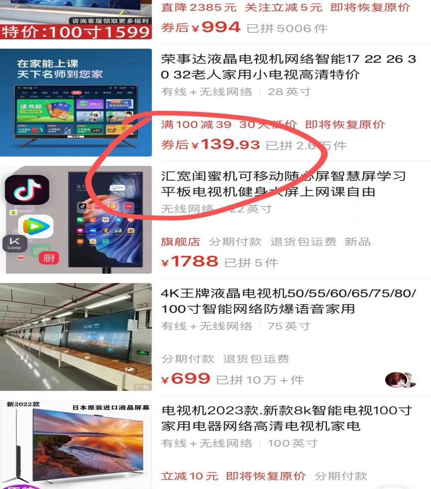 近年来,随着电视硬件配置越来越透明,其中的利润空间也变得越来越小。今年618电商大促期间,电视机价格跌破200元再次引发热议,甚至在某平台最低只需139元就能购买智能屏彩电,大尺寸的液晶屏彩电价格也在几百至一千不等。