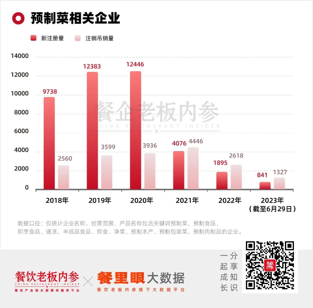 企查查数字显示,2020年,预制菜相关的注册企业为12446家,到2022年,这个数字降低到1895家。同时,预制菜相关企业总量也在下滑,从2020年的63714家下降到61663家。