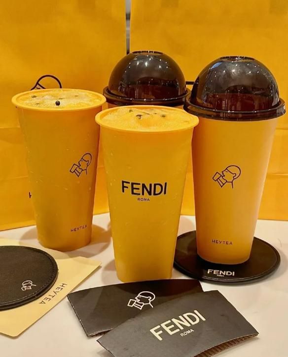 前段时间喜茶与奢侈品Fendi的联名,被众多网友戏称为“自己离奢侈品最近的一次”。单杯19元的价格,购买双杯就送FENDI联名徽章或FENDI联名杯垫,可以说是花小钱装大“杯”。