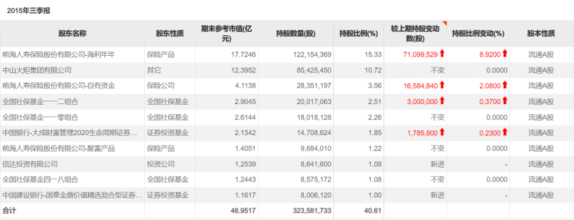 2015年4月,姚振华通过前海人寿举牌并增持中炬高新,成为中炬高新第二大股东。根据中炬高新当年第三季度报告,前海人寿以持股比例15.33%跃居第一大股东。