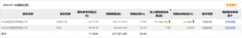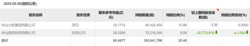 第一次减持在2021年8月9日,中山润田减持中炬高新170万股,持股比例减少至24.79%。到了2022年7月18日,中山润田的持股比例已下降至17.84%,仅高于第二大股东火炬集团7.12%。