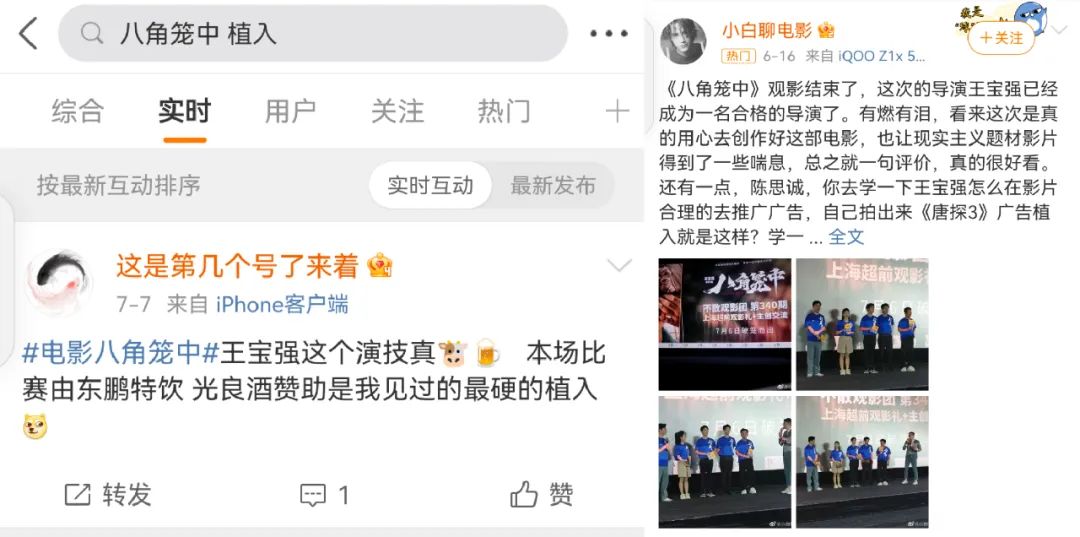 这其中,在电影中频密出现的植入式广告,如东鹏特饮、光良、成都航空等,成为了《八角笼中》被提及最多的商业化看点。