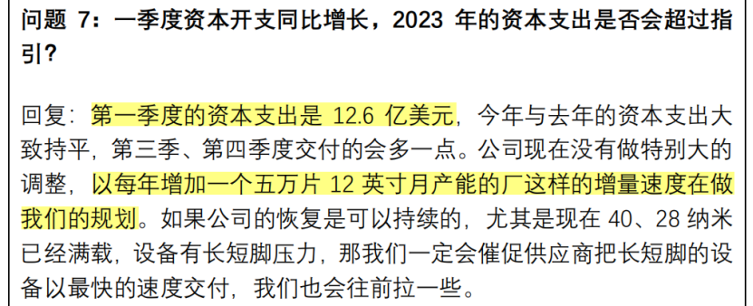 在一季度业绩说明会上,中芯国际称,第一季度的资本支出是12.6亿美元,以每年增加一个五万片12英寸月产能的厂这样的增量速度在做规划。