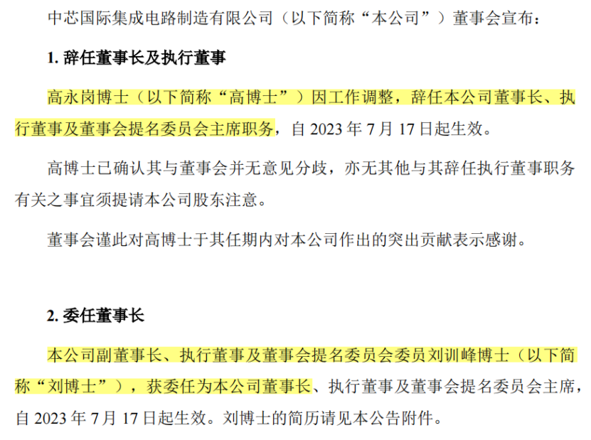 7月17日傍晚,中芯国际公告称,高永岗因工作调整,辞任公司董事长等职务,由副董事长刘训峰接任,人事变动自7月17日起生效。