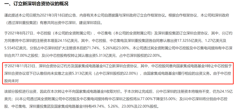 2021年11月23日晚间,中芯国际又发公告称,该公司全资附属公司中芯控股同意向芯片大基金二期转让中芯控股于深圳合资协议下已认缴但尚未实缴出资的5.313亿美元(占中芯深圳股权的22.00%),由后者履行相应的出资义务。