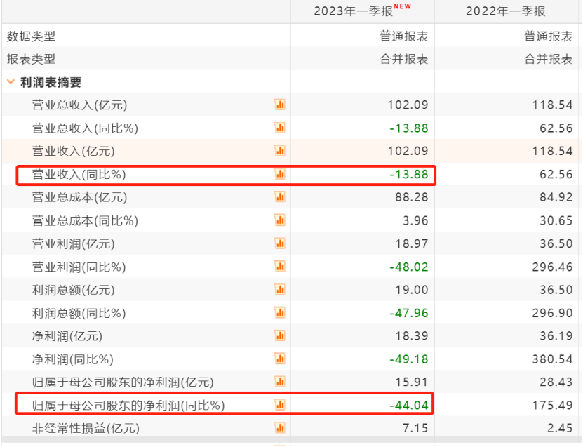 今年一季报显示,中芯国际营收为102.09亿元,同比下降13.9%;归母净利润15.91亿元,同比下降44%。