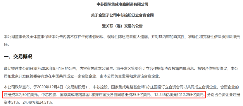 中芯控股、芯片大基金二期和亦庄国投分别出资25.5亿美元、12.245亿美元和12.255亿美元,分别占合资企业注册资本51%、24.49%和24.51%,三方的投资形式均为现金出资。