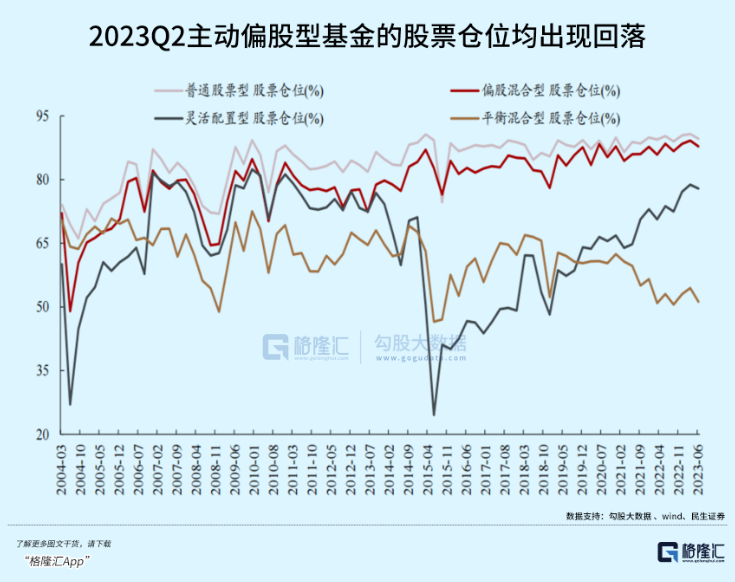 在总仓位方面,二季度,偏股型、普通股票型、偏股混合型、灵活配置型的仓位都出现了稍明显的环比下滑。